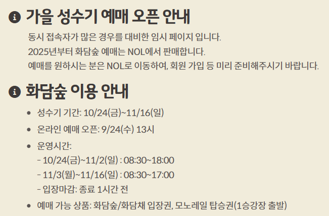 가을 단풍 시즌에는 예약 경쟁이 치열합니다. 보통 예약은 30일 전부터 가능하며, 단풍이 절정에 이르는 10월 중순~11월 초 주말은 오픈과 동시에 마감되는 경우가 많습니다. 따라서 주중 방문을 고려하거나 새벽 예약 오픈 시간에 맞춰 접속하는 방법을 추천드립니다.